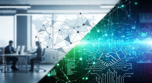 © Mohammad, Naklejka premium A split view of business meeting and digital handshake with connected network and data visualization