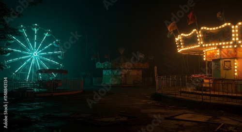 Obraz premium A spooky, abandoned carnival at night, with dilapidated rides and flickering...