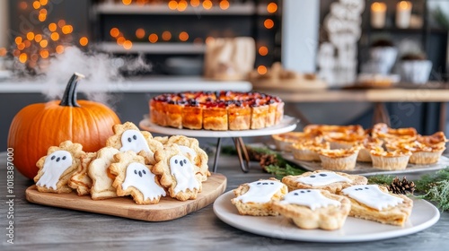 Fototapeta premium A spooky family picnic with ghost-shaped sandwiches pumpkin pie slices