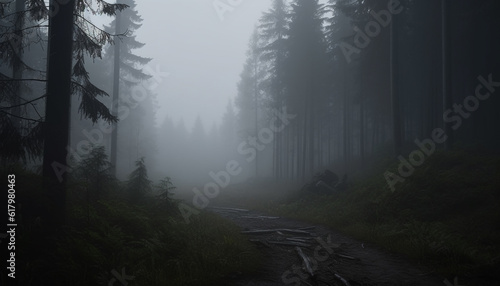 Naklejka premium A spooky forest footpath vanishing into the mysterious fog generated by AI
