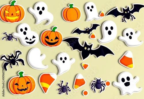 © Boonyapawn, Naklejka premium A spooky, fun collection of Halloween icons, including pumpkins, ghosts, bats, spiders, and candy corn, perfect for stickers and prints, witch, print