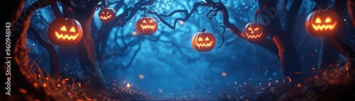 Fototapeta premium A spooky Halloween forest scene with glowing jack-o'-lanterns illuminating...