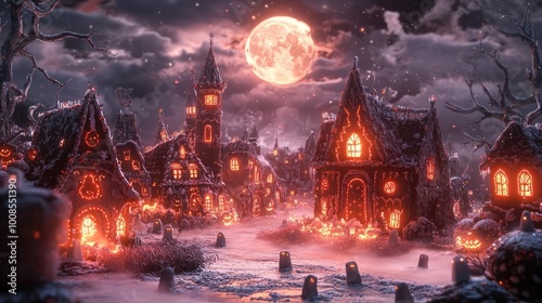 Naklejka premium A spooky Halloween night scene featuring eerie houses, glowing pumpkins, and a bright full moon casting shadows.