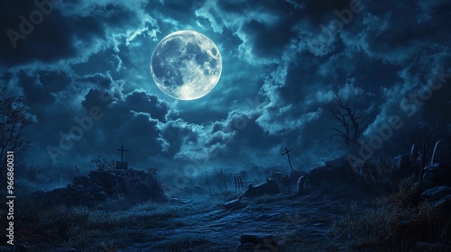 Fototapeta premium A spooky Halloween night scene with a full moon, dark clouds, and eerie shadows.