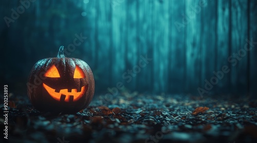 © Pual GotoMars, Naklejka premium A spooky Halloween pumpkin with a glowing face, set against a mysterious forest background, perfect for seasonal decor.
