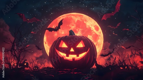 © Ben Kuang, Fototapeta premium A spooky Halloween scene featuring a glowing pumpkin under a full moon.