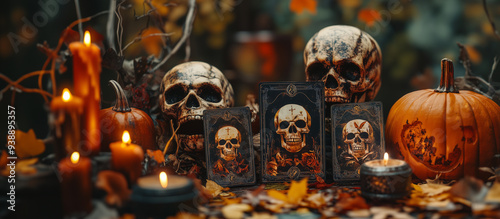 Fototapeta premium A spooky Halloween scene featuring skull-themed tarot cards. Autumn-Halloween...