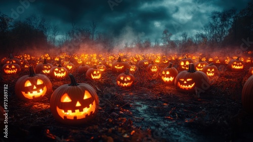 Fototapeta premium A spooky Halloween scene filled with glowing jack-o'-lanterns.