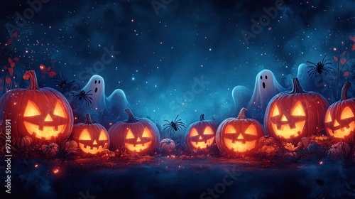 Fototapeta premium A spooky Halloween scene with glowing jack-o'-lanterns and ghosts.