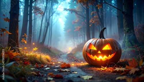 Naklejka premium A spooky jack-o'-lantern glows on a trail winding through a misty autumn forest, with trees and falling leaves