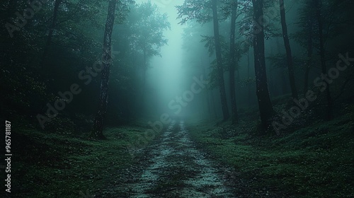 Fototapeta premium A spooky misty forest path perfect for Halloween-themed designs. Ideal for...