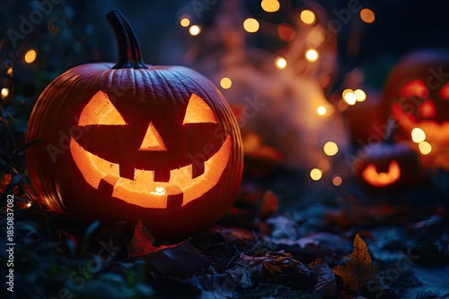Fototapeta premium A spooky night scene with a jack-o'-lantern glowing in the dark, surrounded...
