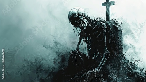 © prabhada, Fototapeta premium a spooky skeleton emerging from a grave, Halloween scene, digital painting,