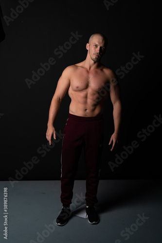 Naklejka premium A sports guy of beautiful strength builds muscles in training. Strong bodybuilder, best abs, shoulders, biceps, quadriceps and triceps.