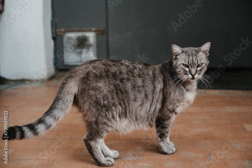Naklejka premium A spotted street cat sitting at the entrance door. Gurzuf cats
