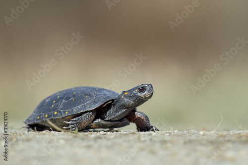 © rayhennessy, Obraz premium A Spotted Turtle walks across a sandy road on a bright sunny day.