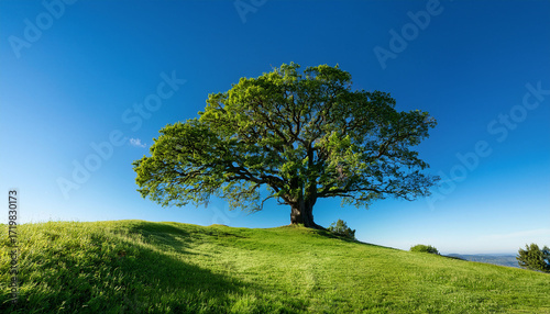 © Tessa, Obraz premium A Sprawling Ancient Tree Stands On A Grassy Hilltop Surrounded By Lush Vegetation Beneath A Tranquil Cloudless Blue Sky