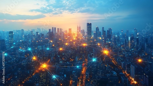 Fototapeta premium A sprawling cityscape with glowing data cables and wireless signals connecting smart buildings and transportation networks. The city lights up with vibrant neon pathways,