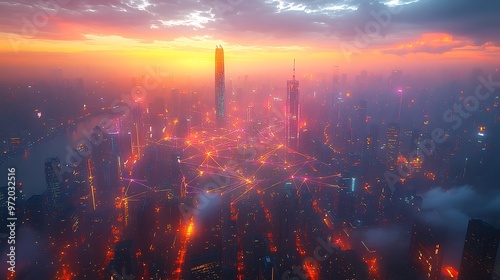 Fototapeta premium A sprawling cityscape with glowing data cables and wireless signals connecting smart buildings and transportation networks. The city lights up with vibrant neon pathways,