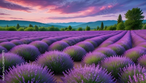 © Zafar, Obraz premium "A sprawling field of lavender flowers in full bloom, with their purple hues contrasting against the deep green foliage and a bright summer sky."
