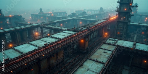 © Nova, Fototapeta premium A sprawling industrial complex at twilight, exhibiting a network of elevated walkways and structures, illuminated by scattered lights, creating a mysterious and atmospheric scene.