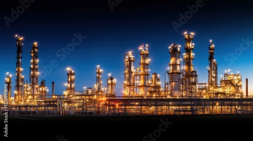 Naklejka premium A sprawling industrial complex illuminated at night, showcasing towering...