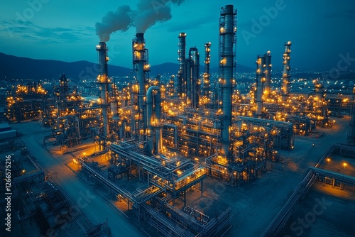 © Nata, Fototapeta premium A sprawling oil refinery glows under the night sky. Generative AI