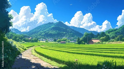 © Sinechana, Fototapeta premium 90.A sprawling rice field with symmetrical green rows bathed in sunlight, the clear blue sky dotted with soft clouds, creating a peaceful and idyllic countryside view.