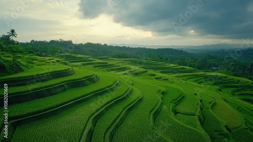 Fototapeta premium A sprawling rice terrace landscape in Asia, with layers of green fields under a cloudy sky.
