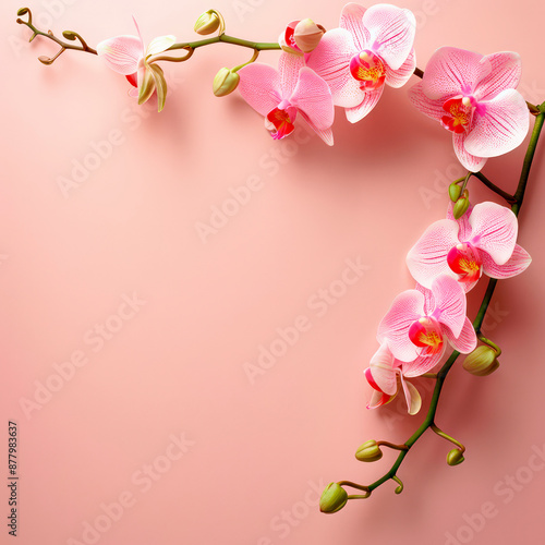 © Kushch, Naklejka premium A sprig of pink phalaenopsis orchid on a pink background. Copy space.