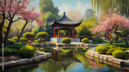 Fototapeta premium A Spring Chinese Garden in Impressionist Style