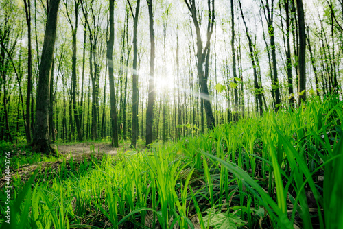 Fototapeta premium a spring forest trees. nature green wood sunlight backgrounds.