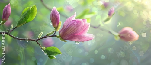 © ND STOCK, Obraz premium A spring pink and purple magnolia blossom flower branch, magnolia tree blossoms in springtime. tender pink flowers bathing in sunlight. warm april weather There are dew drops in the morning.