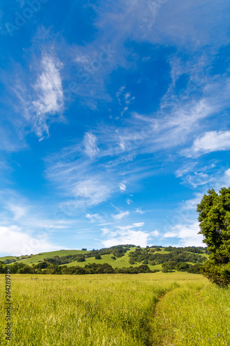 © Timothy, Obraz premium A spring time grassland with a path way in the middle is seen with a large green tree on the right. A hill and blue sky is in the background. Large wispy clouds are in the blue sky. A vertical image