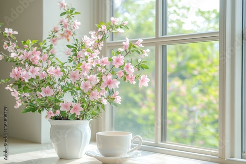 © Sans, Fototapeta premium A springtime window display of delicate pink flowers.