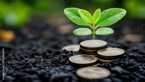 Naklejka premium A sprouting plant emerges from a bed of coins, symbolizing growth,...