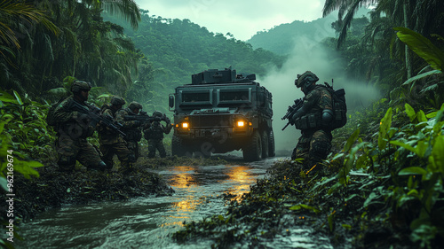 © Dzmitry, Obraz premium A squad of advanced soldiers maneuvering through a jungle terrain during a tactical operation at dawn