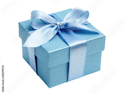 © Sawyer0, Fototapeta premium A square blue ribbon gift box with satin bow on top, shown with slight perspective tilt, isolated on transparent background.