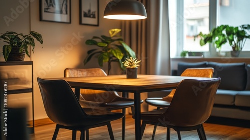 © Intach, Obraz premium A square dining table under a retro-style lamp, surrounded by four leather chairs in a cozy interior with warm, neutral lighting