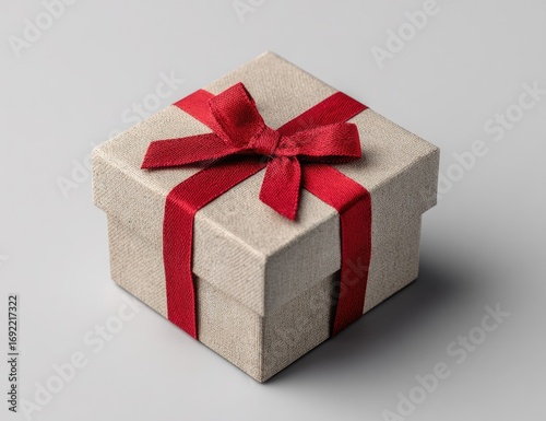 © Fartner, Obraz premium A square gift box, light beige color, adorned with a red ribbon and bow, sits on a plain gray background