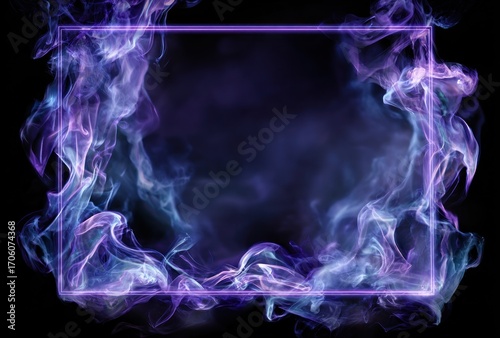 © lai, Obraz premium A square neon frame surrounded by wispy, blue and purple smoke or vapor against a dark background, creating a mystical, ethereal effect