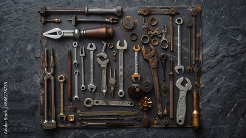 Fototapeta premium A square of assorted engineering tools on a dark grey backdrop.