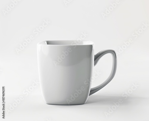 Fototapeta premium A square-shaped white ceramic mug with a gray handle, placed on a white...
