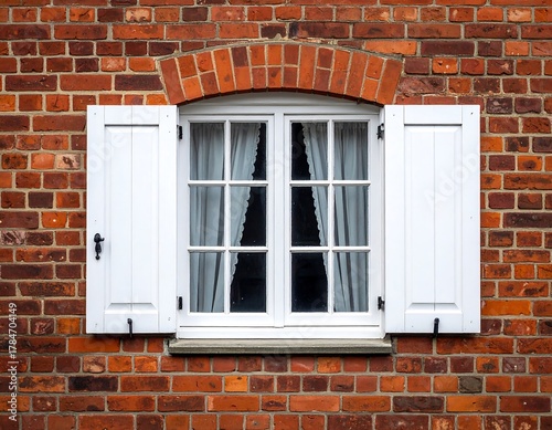 © Bambu, Fototapeta premium A square white-framed window with matching shutters sits centered in a reddish-brown brick wall, simple and classic