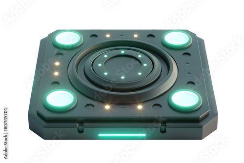 Fototapeta premium A square with a green circle in the middle and four green circles around it, science fiction, isolate on white background.