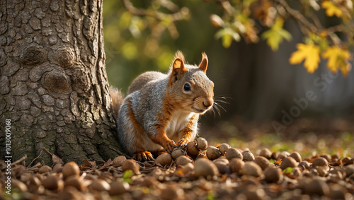 © 99___Designer, Obraz premium A Squirrel Gathering Acorns