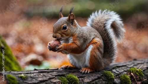 © TECHUB, Fototapeta premium A squirrel holding a nut on a mossy log, bokeh background, macro style