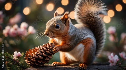 © AnisaHasby, Fototapeta premium A squirrel holding a pine cone amidst flowers and soft lights.