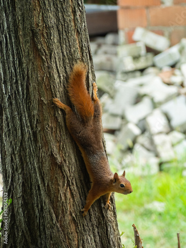 © gokcen, Fototapeta premium A squirrel holding on to a tree trunk with wide open limbs facing downwards, monitoring its surrounding