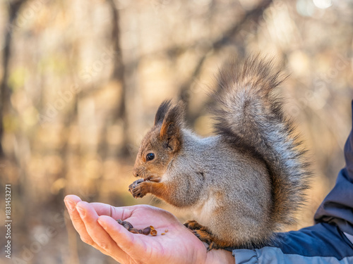 Fototapeta premium A squirrel in the spring or autumn eats nuts from a human hand. Eurasian red...